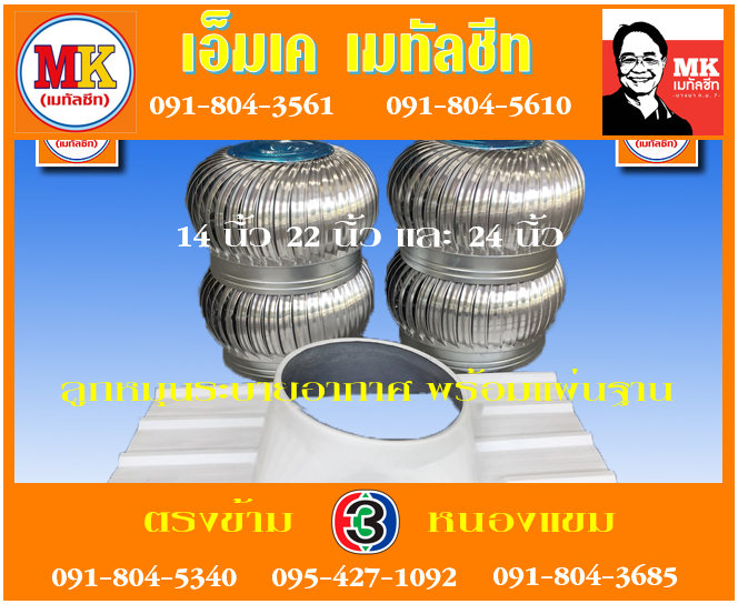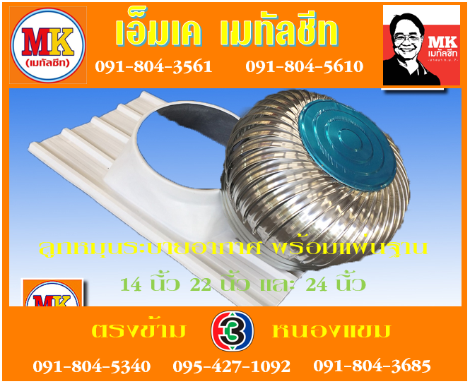 เอ็มเค เมทัลชีท สาขาเพชรเกษม 77/1 จำหน่ายลูกหมุนระบายอากาศขนาด 24นิ้ว 22 นิ้ว และ 14 นิ้ว พร้อมแผ่นฐาน เพื่อใช้ในโรงงานอุตสาหกรรมและหลังคาบ้าน หรือหลังคาห้องครัว