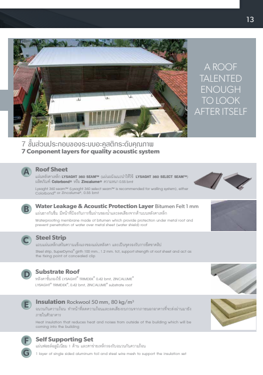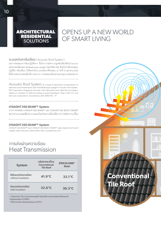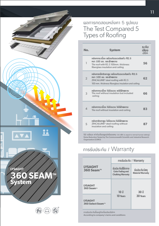 จากการทดสอบสามารถลดเสียงรบกวนจากภายนอกได้ดีกว่าหลังคาทั่วไปABLE TO REDUCE OUTSIDE NOISE BETTER THAN CONVENTIONAL ROOF